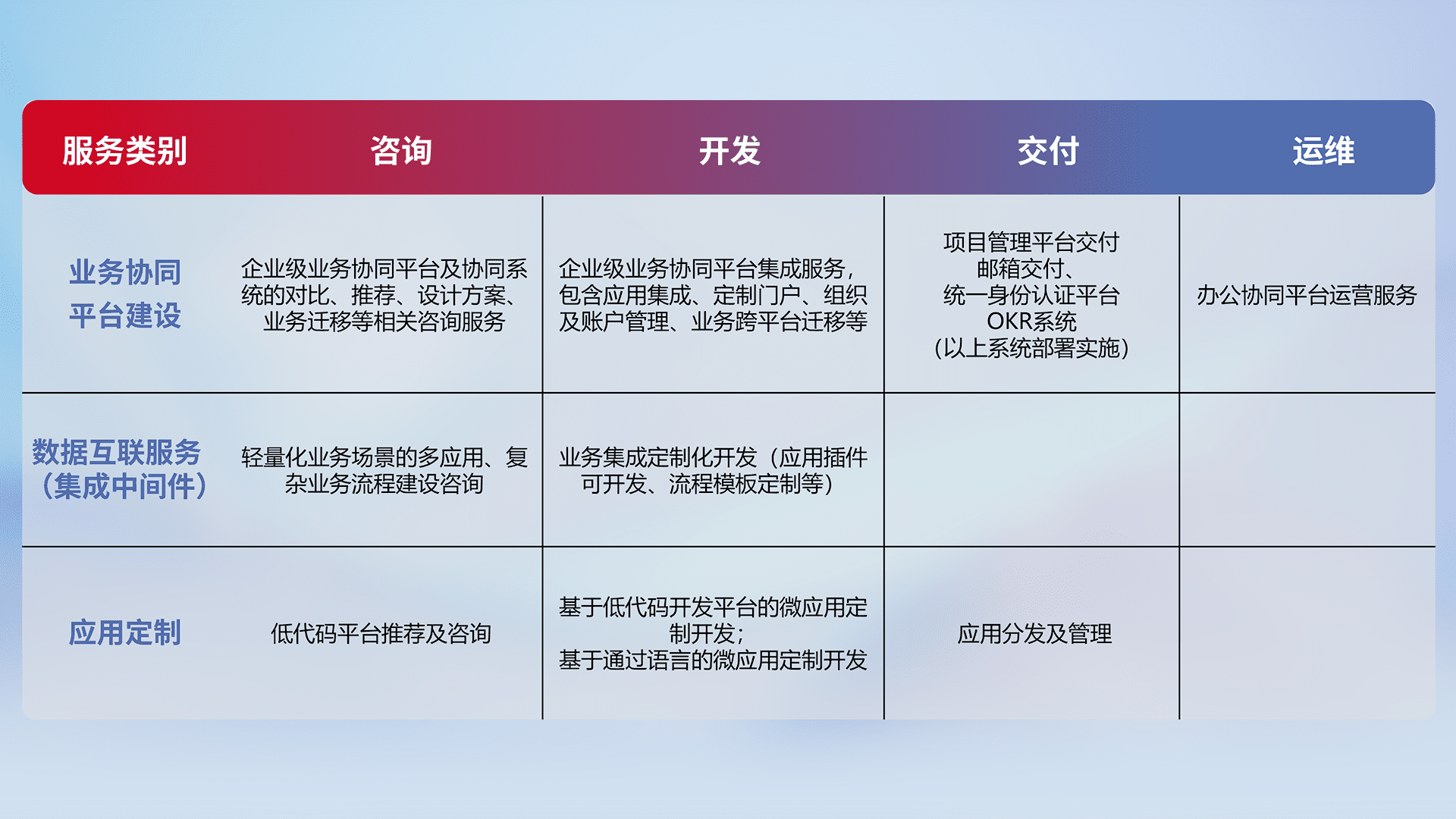 针对钉钉、、企微、、、IDaas等平台级产品提供产品的规划、、、、方案、、、、交付、、、定制化开发等服务,,,,实现如统一协同办公、、、智能客户服务、、、混合会议管理、、、智能数据查询、、、等业务场景,,,,实现数字化转型。。。