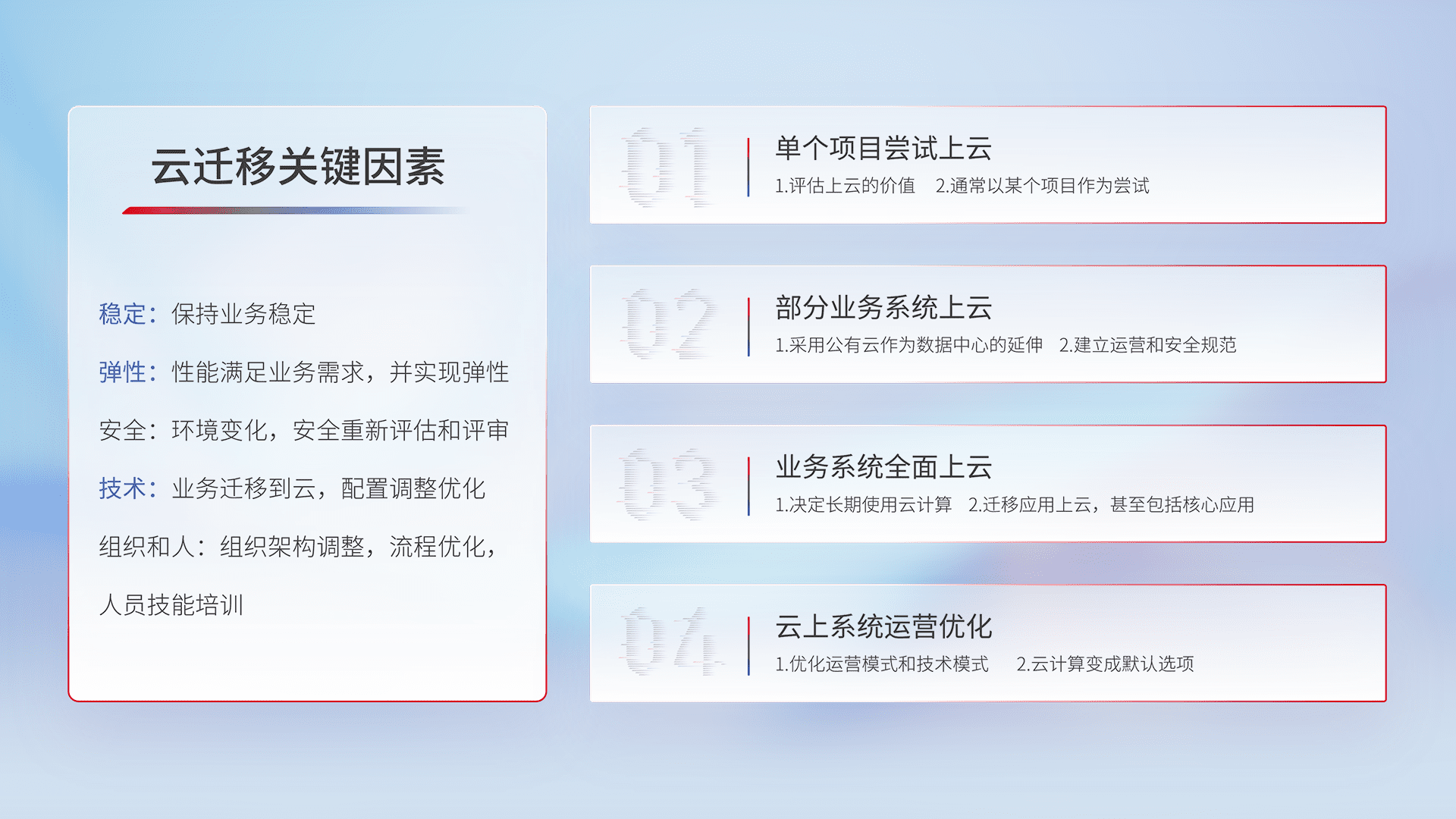 结合实际业务,,,,从规划设计、、、、云平台选型、、、云原生改造、、数据迁移、、、集成交付,,,,迁移全过程为客户识别最佳上云路径,,做好风险识别管理,,,,设计网络架构、、、身份权限、、安全审计合规、、、操作审计、、日志审计、、监控告警策略、、、多站点容灾设计等,,,,对云上基础设施进行整体规划,,,提升IT治理水平,,,以满足弹性、、高可用、、高性能的需求。。。