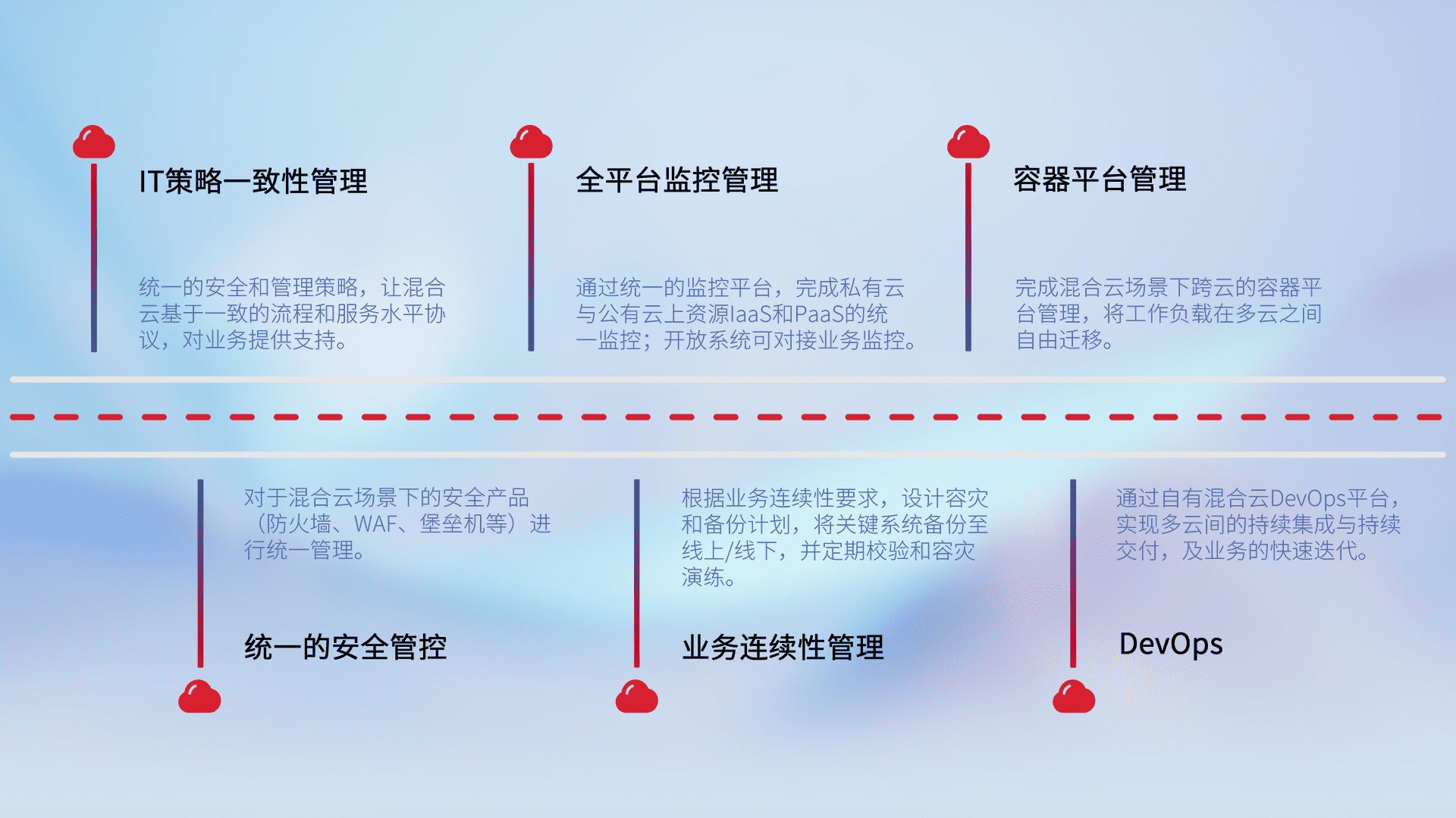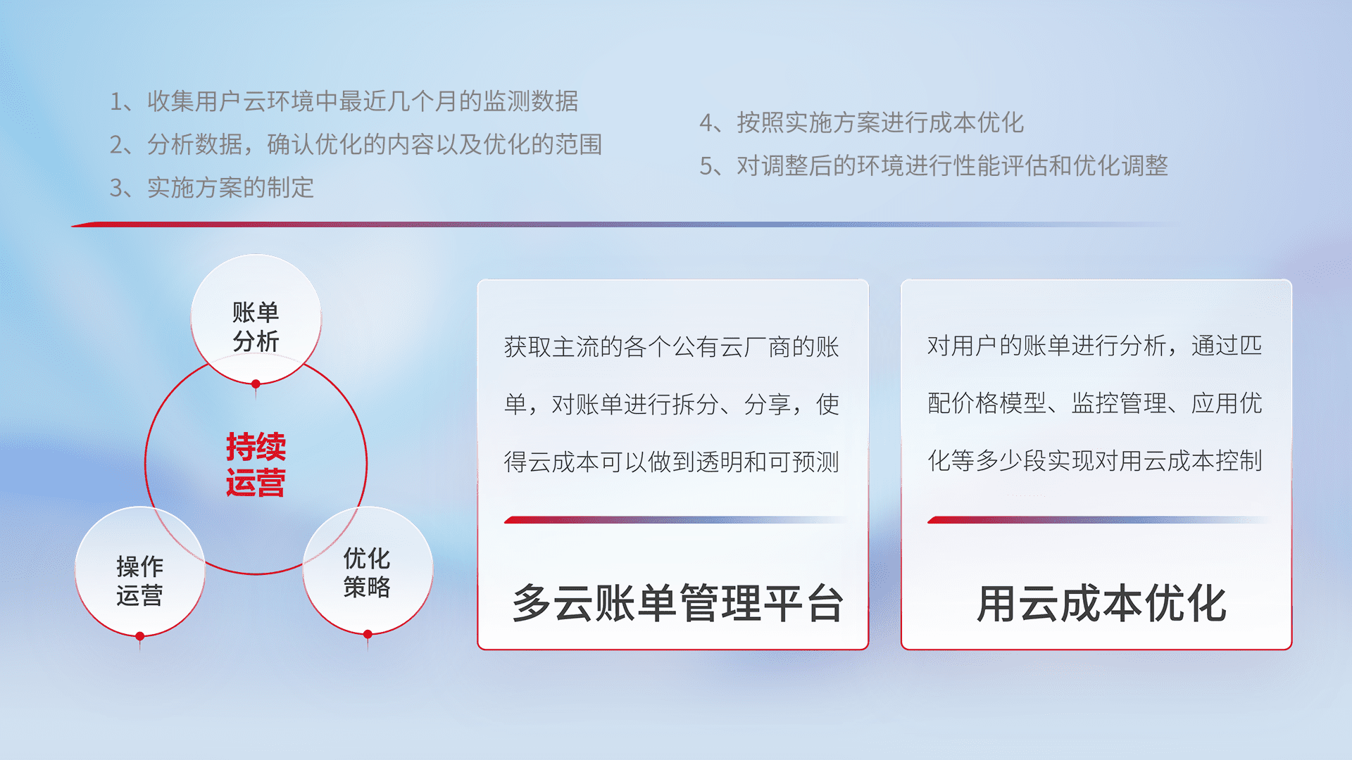 通过多云纳管,,以统一的资源数据模型把客户的云资源进行抽象和封装,,,,进而实现对多云资源的统一操作,,保障云资源管理的可靠性、、稳定性与可用性。。量身定制化运维内容,,配置、、开发运维、、补丁管理、、备份、、、监控、、、认证和访问管理、、审计和日常巡检等,,,保障在用云过程中的可靠度,,稳定度以及高可用率。。。